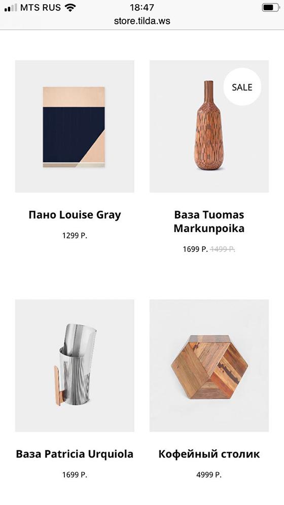 Показывайте товары в 2 колонки в мобильной версии. Добавляйте функцию увеличения изображения товара при наведении. Предлагайте дополнительные позиции в карточке товара.