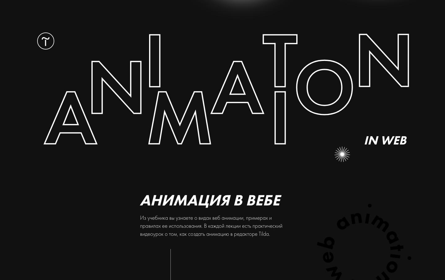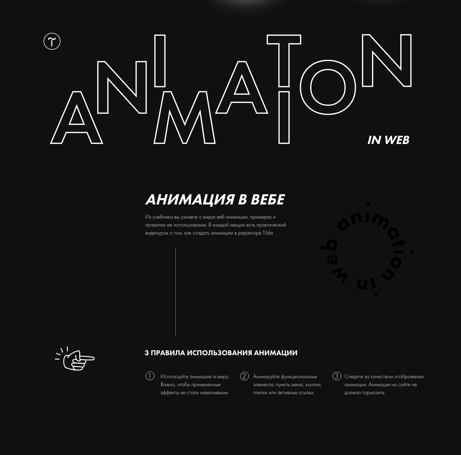 Учебник о видах веб-анимации, примерах и правилах ее использования. В каждой лекции есть практический видеоурок о том, как создать анимацию в редакторе Tilda и уместно применить ее к контенту проекта.