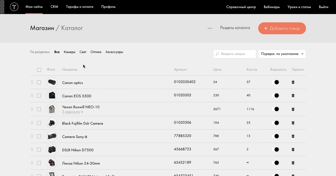 Создавайте разделы, добавляйте и редактируйте товары, указывайте дополнительные опции и варианты товара с разной ценой и параметрами. Изменения в каталоге мгновенно отобразятся на всех страницах сайта.