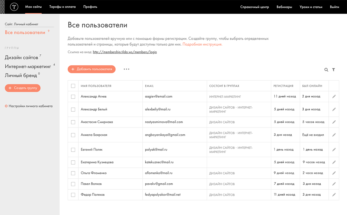 Приглашайте или добавляйте пользователей. Создавайте группы доступа к разным страницам сайта. Закрытые материалы и страница входа будут на вашем домене.