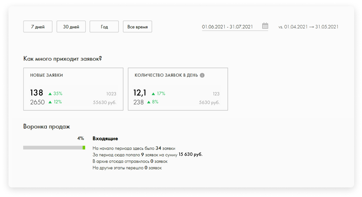 Также в статистике есть отчёт по каждому этапу воронки в лидах, деньгах и процентах. Все данные можно смотреть за неделю, месяц, год и за всё время и сравнивать с другими периодами.