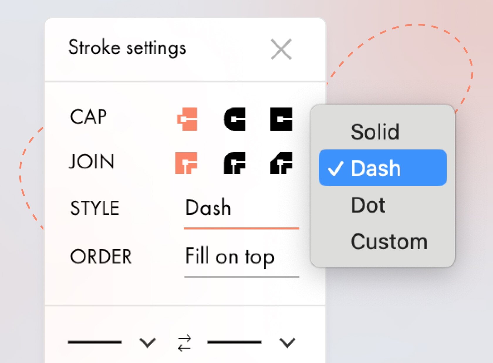 Выбирайте один из заданных стилей обводки или настройте свой вариант. Укажите тип соединения точек вектора, порядок заливки и обводки, а также как будет выглядеть начало и конец линии.
