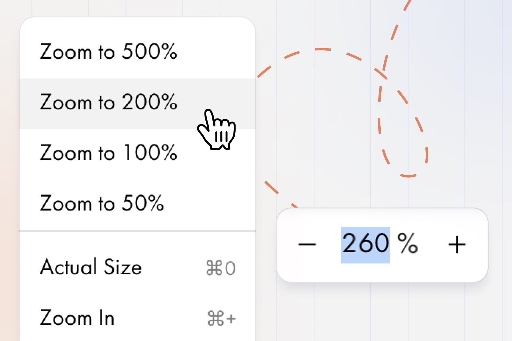 Управляйте масштабом холста. Введите значение зума с клавиатуры или воспользуйтесь командами из выпадающего меню.