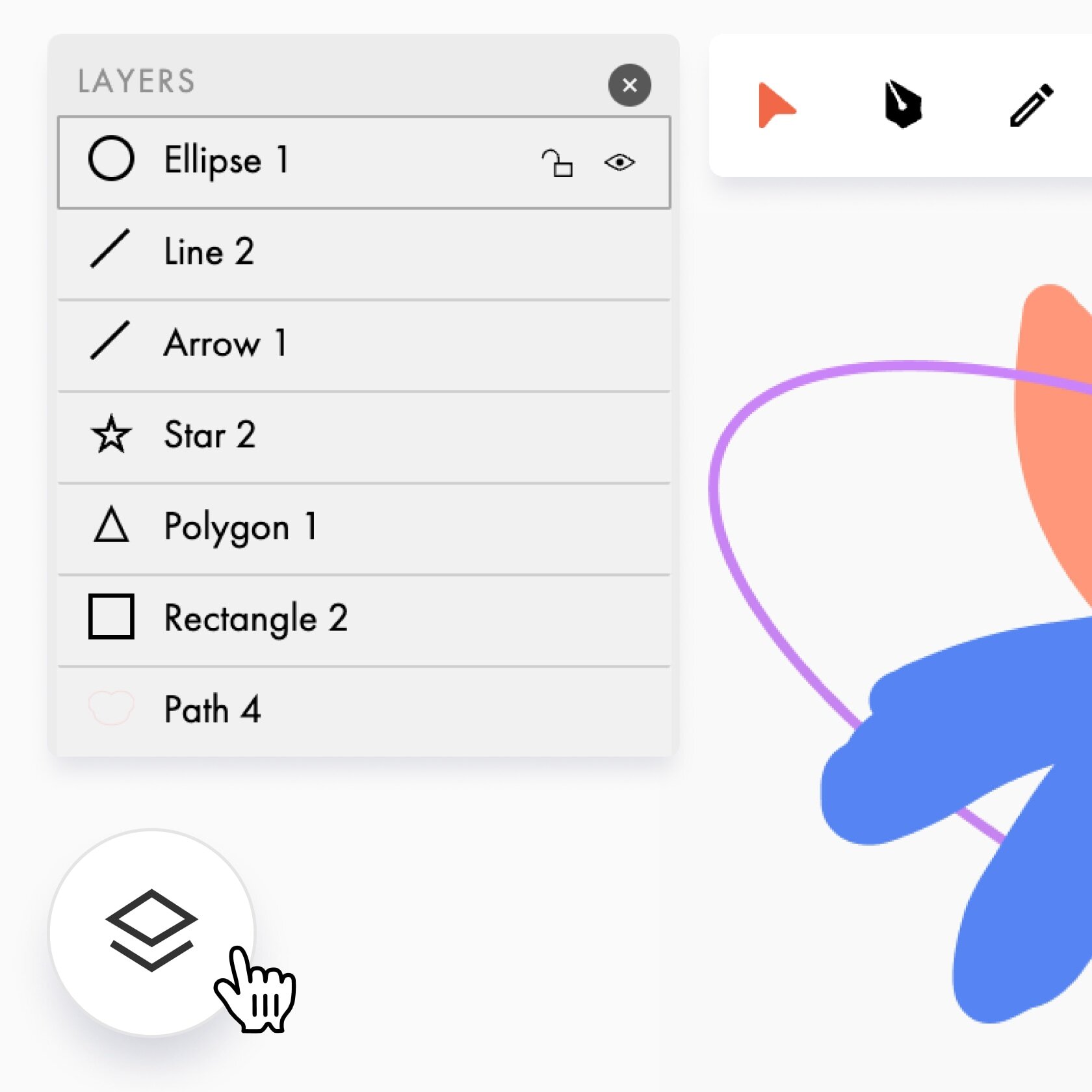 В панели слоёв можно редактировать порядок фигур, фиксировать и скрывать их, а также переименовывать. Чтобы открыть панель слоёв, кликните на кнопку в левом нижнем углу экрана или выберите Layers в меню верхней панели.