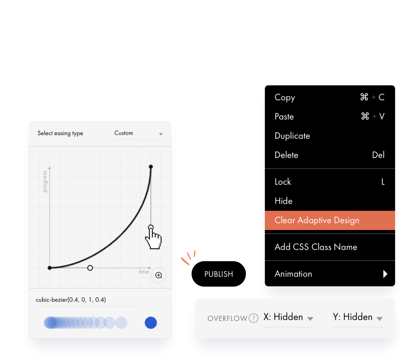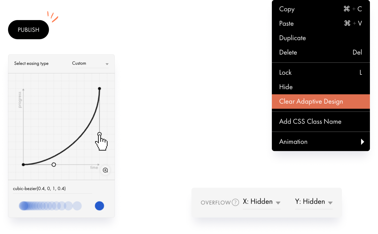 Теперь вы можете более гибко настраивать easing для каждого шага анимации. Ранее были доступны пять базовых типов изингов: linear, ease-in, ease-out, ease-in-out, elastic-fin. К ним добавилась возможность изменять easing вручную, задавать точные координаты для этой функции, а также 24 новых типа easing.