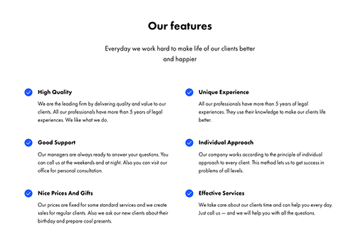 2. Список преимуществ в две колонки с настраиваемыми галочками. FR207, категория «Преимущества»