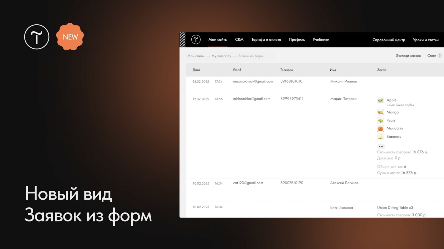 ↖️ При клике на заявку откроется карточка, где будут видны отправленные клиентом данные и информация о заказе.