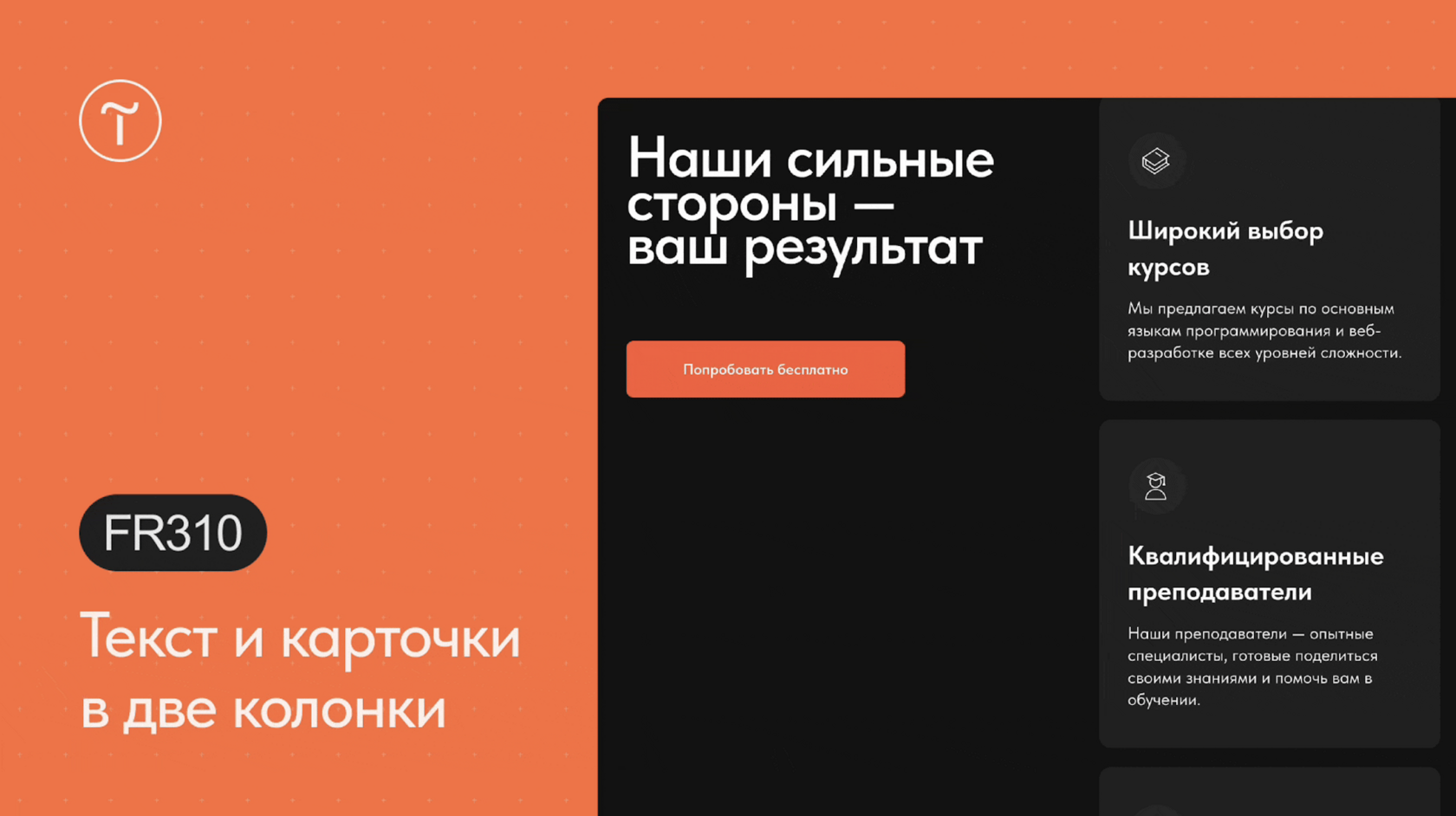 В новом блоке FR310 из категории «Преимущества» можно гибко настраивать текст и карточки в две колонки. Так, можно увеличивать и уменьшать количество карточек в колонке и настроить шапку блока.